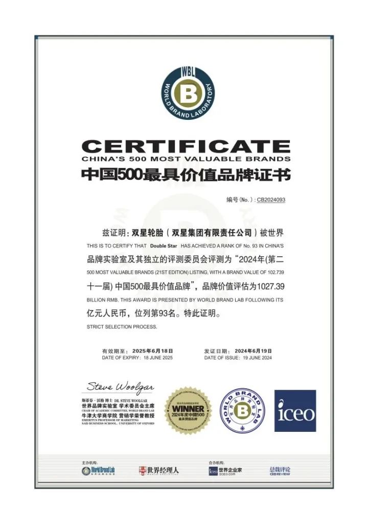 品牌价值突破千亿!双星轮胎荣膺“中国500最具价值品牌” 一连领跑中国轮胎品牌