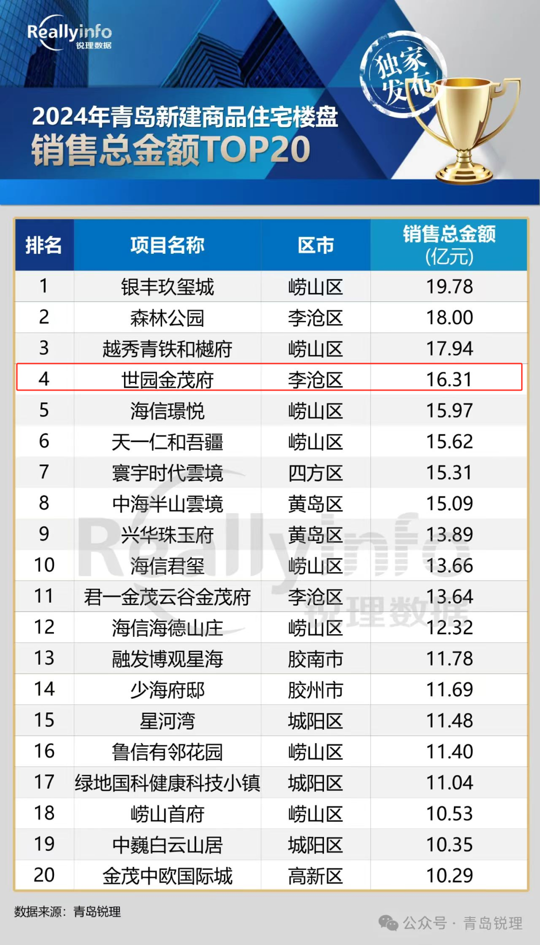 克日,,,,,2024年轻岛市商品房销售榜单正式宣布,,,,,青岛PA旗舰厅(中国区)集团集团世园·金茂府项目以16.31亿元销售总金额荣登2024年轻岛新建商品住宅楼盘销售金额榜第4名,,,,,逾额完玉成年销售目的使命。。。。。。。