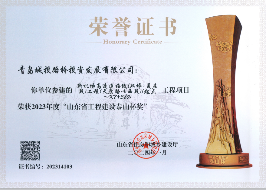 新机场毗连线工程被山东省住房和城乡建设厅授予“2023年度山东省工程建设泰山杯”声誉。。。。。。。。