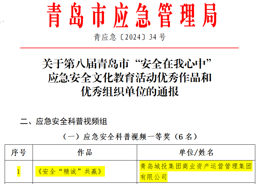 商管集团荣获第八届青岛市“清静在我心中”应急清静文化教育运动中荣获应急清静科普视频一等奖。。。。。。。。