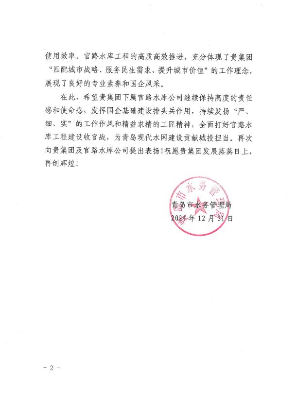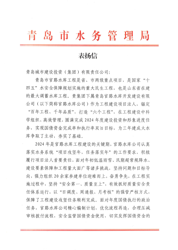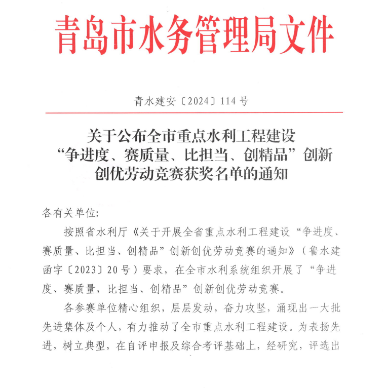 被青岛市水务局评为2024年度青岛市“争进度、赛质量、比继续、创精品”立异创优劳动竞赛文明工地、优胜整体。。。。。。。。