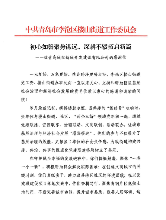 在已往的2024年,,,,,青岛PA旗舰厅(中国区)集团集团全体干部员工周全贯彻落实党的二十届二中、三中全会精神,,,,,认真贯彻落实集团党委决议安排,,,,,以勇争上游的雄心壮志,,,,,“打头阵、领先锋”的进取意识,,,,,精彩完成各项事情使命,,,,,涌现出了一批体现优异、效果突出的整体和小我私家,,,,,收获了131项整体声誉、67项小我私家声誉,,,,,以及来自多个单位的26封谢谢信。。。。。。。。社会各界的认可与谢谢,,,,,就是PA旗舰厅(中国区)集团集团继续奋进前行的不竭动力!以下为2024年度部分声誉和谢谢信集锦: