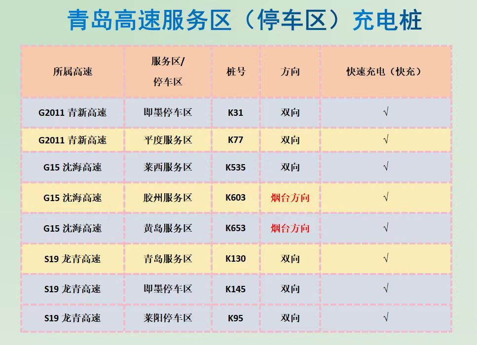青新高速K31即墨停车区双向、青新高速K77平度效劳区双向、沈海高速K535莱洋装务区双向、沈海高速K603胶州效劳区烟台偏向、沈海高速K653黄岛效劳区烟台偏向、龙青高速K130青岛效劳区双向、龙青高速K145即墨停车区双向、龙青高速K95莱阳停车区双向。。。 。。。。