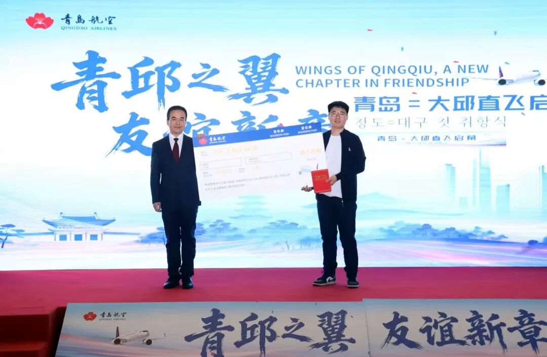 山海为媒,,,,,,,友城共舞。。。。。。。。青岛与大邱自1993年缔结友好都会关系以来,,,,,,,始终坚持着亲近的经贸互动与人文往来。。。。。。。。现在,,,,,,,随着青岛=大邱直飞航线的开通,,,,,,,两座都会的交流相助再添一条高效便捷的“空中通道”。。。。。。。。